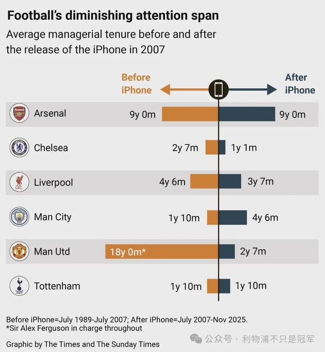 我们生活在一个注意力缺失的时代,置身于注意力经济当中。自iPhone手机2007年问世至今的18年,英国已经历任7任首相,而此前的7任任期长达43年。这种普遍存在的跺脚式的浮躁和缺乏耐心,让足球教练的职位比以往更加岌岌可危。