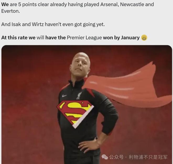 利物浦球迷媒体中一些曾经理性的声音已经转向,有一些粉丝量很大的自媒体在周三公然发文称“斯洛特应该在离开球场之前就被解雇”,而同样是这位球迷,仅仅两个月前曾发布过斯洛特身披超人斗篷的图片,并配文“照这速度,我们明年一月就能锁定英超冠军”。